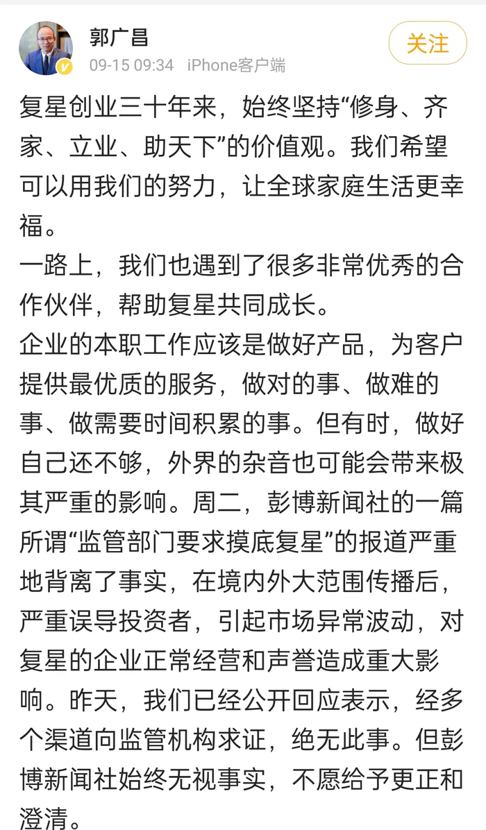 2022年9月15日,其在微博表示,彭博新闻社周二一篇“监管部门要求摸底复星”的报道严重背离事实,在彭博新闻社始终无视事实,不愿给予更正和澄清的情况下,复星将正式向法院提起诉讼。