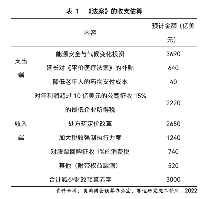 《法案》旨在降低美国家庭成本,应对气候危机,减少财政赤字,促进美国头部公司和收入最高的富人阶层缴纳较为公平的纳税份额。《法案》主要涵盖支出和收入两大方面,预计总支出规模达4370亿美元,总收入规模达7370亿美元,计划削减财政赤字约3000亿美元(见表1)。