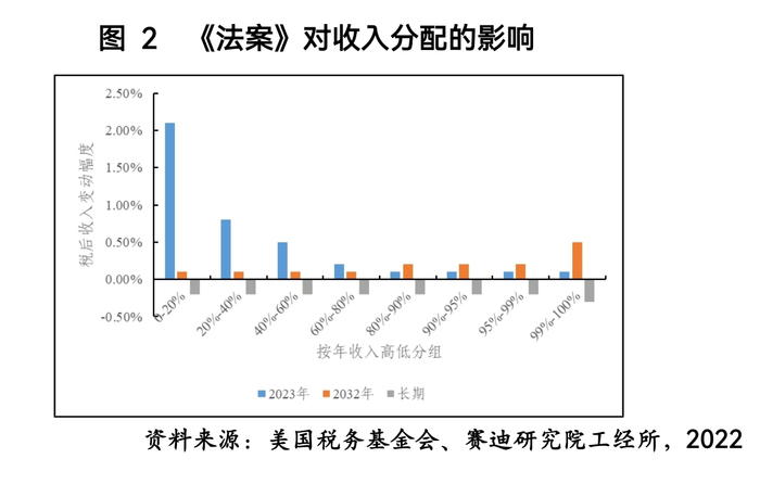 《法案》有利于促进税负公平,改善收入分配。由于医疗保健补贴的增加,到2023年,《法案》将使得低收入人群(收入水平位于后20%的人群)的税后收入增加约2.1%。与此同时,由于能源税收抵免的扩大,抵消了公司最低税和股票回购税造成的收入减少,收入最高的1%人群的税后收入将增长0.1%。而从对长期影响的测算来看,随着大多数税收抵免到期,平均而言,各类收入水平的纳税人的税后收入都会下降,高收入者则面临更高的边际所得税率(见图2)。