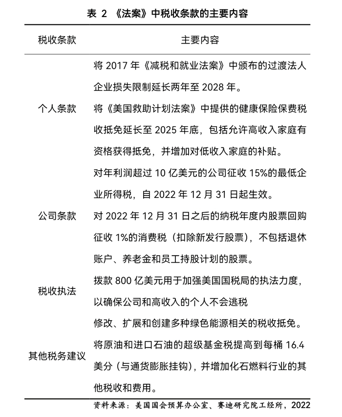 收入端:主要依靠增税、强化税收执法和处方药定价改革。《法案》中明确收入来源依靠税收和处方药定价改革,具体包含四个部分:(1)对年利润超过10亿美元的公司征收15%的最低企业所得税实现2220亿美元的税款;(2)对股票回购征收1%的消费税实现740亿美元的税款;(3)通过税收强制执行实现1240亿美元的追查税款;(4)通过处方药定价改革节省2650亿美元的支出。