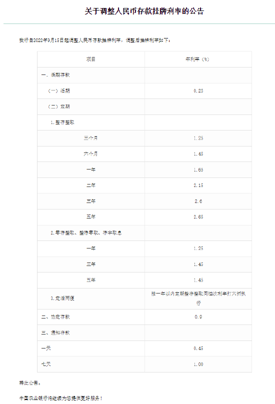 9月15日消息,农业银行今日在官网发布公告称,自2022年9月15日起调整人民币存款挂牌利率。