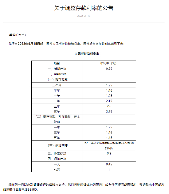 9月15日消息,中国邮政储蓄银行今日发布公告称,自2022年9月15日起调整人民币存款挂牌利率。