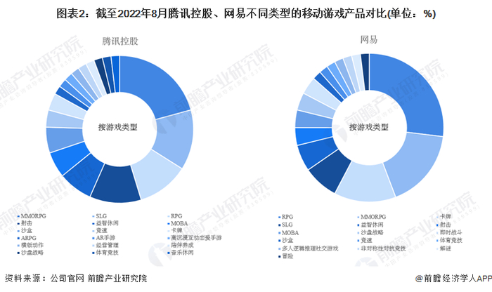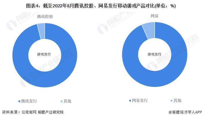 截至2022年8月,腾讯发行的游戏产品占比达96.15%,游戏类型以MMORPG、射击游戏为主,例如《秦时明月世界》、《和平精英》等;网易发行的游戏产品占比达93.48%,游戏类型以RPG、MMORPG、卡牌游戏为主,例如《哈利波特:魔法觉醒》、《暗黑破坏神:不朽》、《阴阳师》。