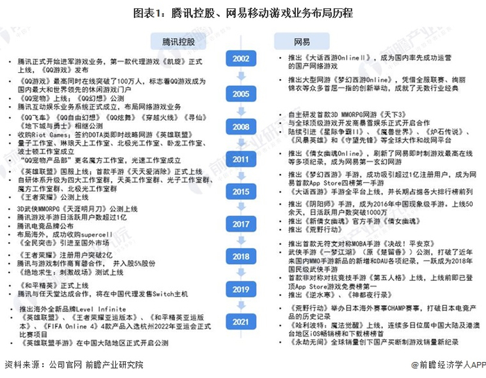 目前,中国移动游戏行业的龙头企业分别是腾讯控股(00700.HK)、网易(09999.HK),两家企业在移动游戏业务上的布局历程如下: