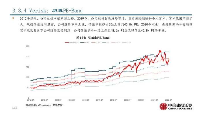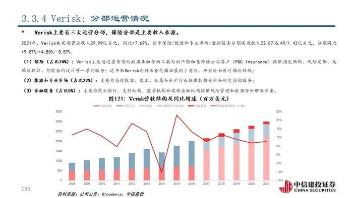 ④Verisk(VRSK US Equity):公司前身为是1971年成立的保险服务办公室(ISO),目前是全球领先的风险管理解决方案提供商,市值达290.01亿美元。公司通过其专有的数据库和分析工具为保险公司客户提供损失预测、风险定价等一系列服务;近年来,Verisk将原有的风险管理资源和优势拓展到能源、银行等新领域。2021年,公司共实现营收29.99亿美元,同比+7.69%;其中保险分部占比73.60%,是公司的主要收入来源。