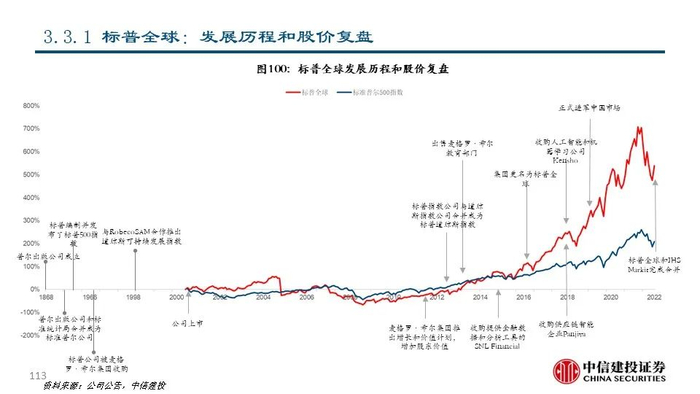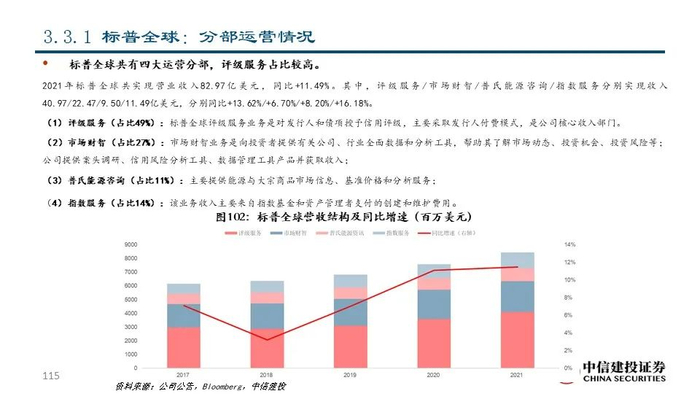 ①标普全球(SPGI US Equity):公司成立于1860年,是全球领先的金融数据及信息服务提供商,市值达1159.35亿美元。公司以美国铁路公司评级业务起家,逐渐成为权威的评级机构和指数提供商,并通过并购SNL Financial和IHS Markit成为了领先的信息服务提供商,为资本市场提供包括金融信息和服务、评级、基准、指数、大宗商品和能源、运输和工程等相关服务。2021年公司共实现营业收入82.97亿美元,同比+11.49%。其中评级服务占比49.38%,是公司的主要收入来源。
