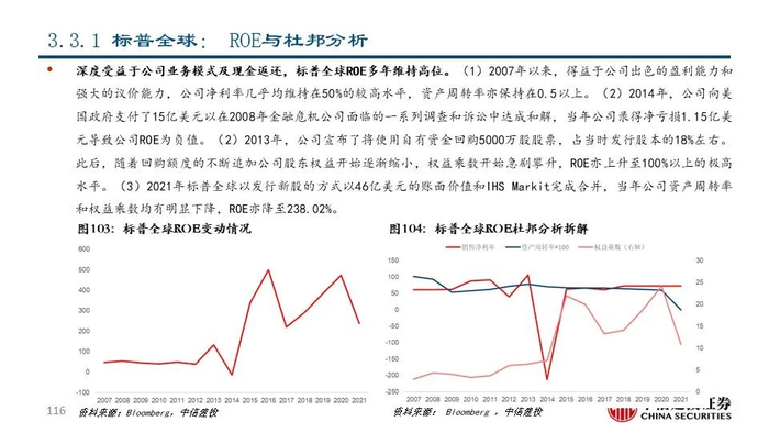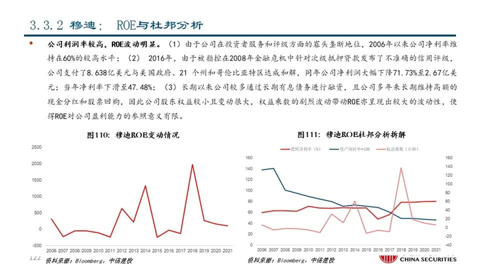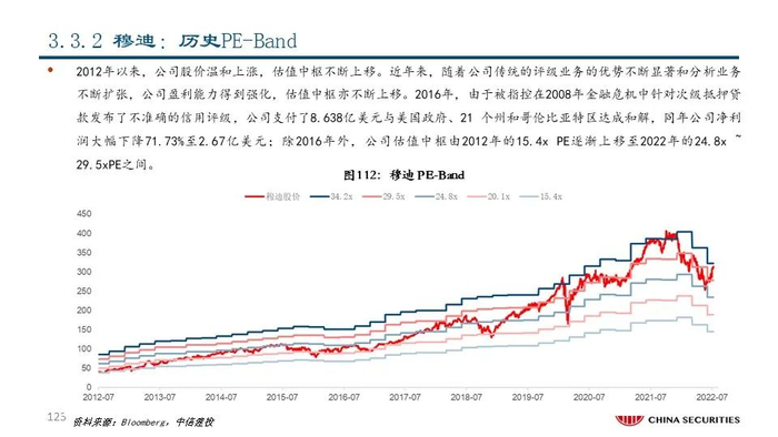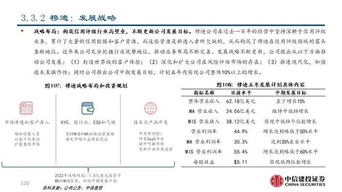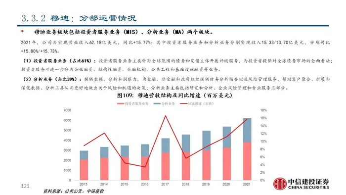 ②穆迪(MCO US Equity):公司成立于1900年,是全球领先的金融分析和投资者服务提供商,市值达521.87亿美元。早在1924年穆迪评级就已覆盖美国100%的债券;近年来公司通过收购企业信息与商业情报提供商毕威迪将其业务扩展到新的解决方案市场领域。2021年,公司共实现营收62.18亿美元,同比+15.77%;其中包含评级服务在内的投资者服务业务和包括金融数据、分析工具和研究服务的分析业务分别占比61%和39%。