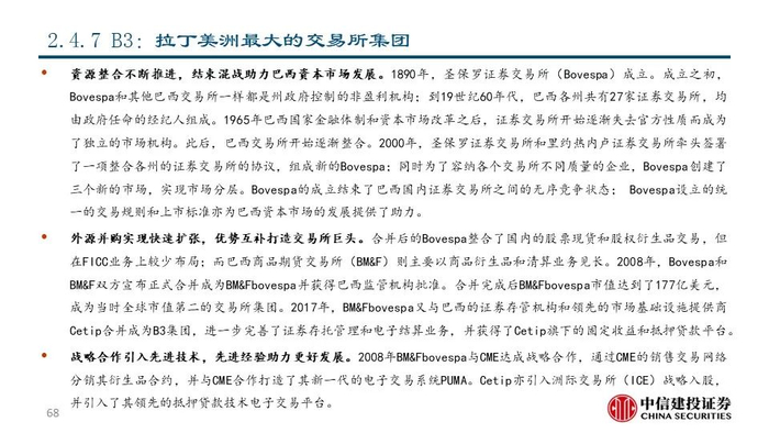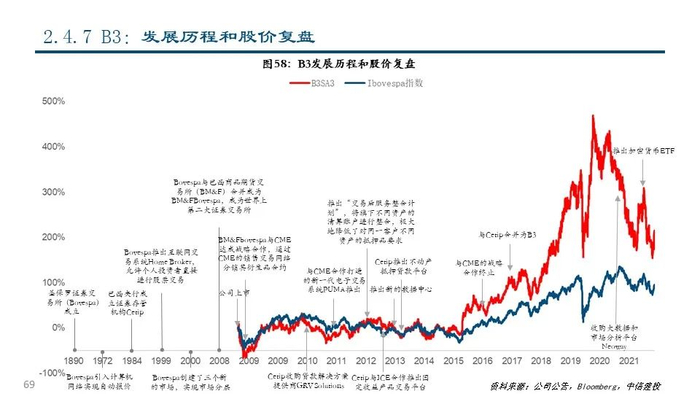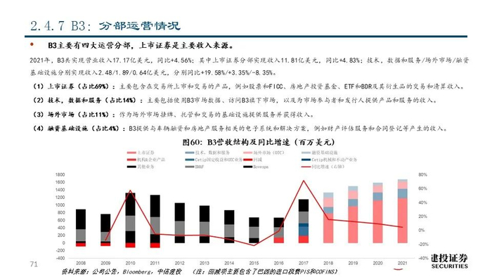 ⑦B3(B3SA3 BZ Equity):公司最早可追溯到1890年成立的圣保罗证券交易所(Bovespa),通过一系列的兼并整合成为拉丁美洲最大的交易所集团,目前市值达到148.12亿美元。2021年,公司实现营收17.17亿美元,同比+4.56%;其中包含上市证券及衍生品的挂牌上市、交易、清算等在内的上市证券分部占比达68.78%,是公司的主要收入来源。