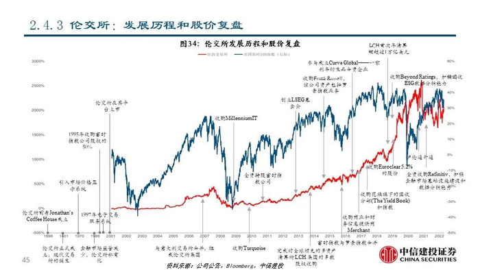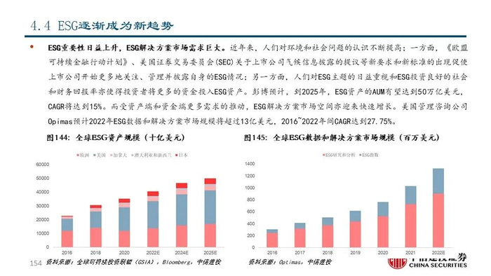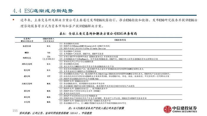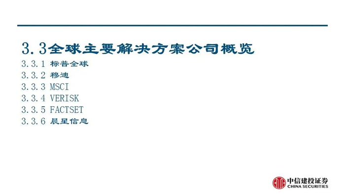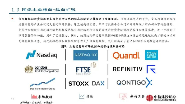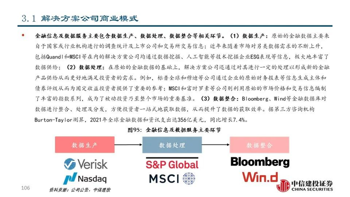 我们发现,近年来交易所和解决方案公司围绕投资者的关键流程为其提供一系列金融信息、分析工具及研究服务等解决方案,从而为投资决策赋能。具体来看,交易所和解决方案公司的业务布局呈现出以下趋势:1)沿着数据生产、数据处理、数据整合等产业链环节进行纵向扩张和资源整合;2)顺应被动投资浪潮,积极拓展指数业务;3)持续推出ESG治理和相关解决方案以满足人们对ESG日益重视的需求。
