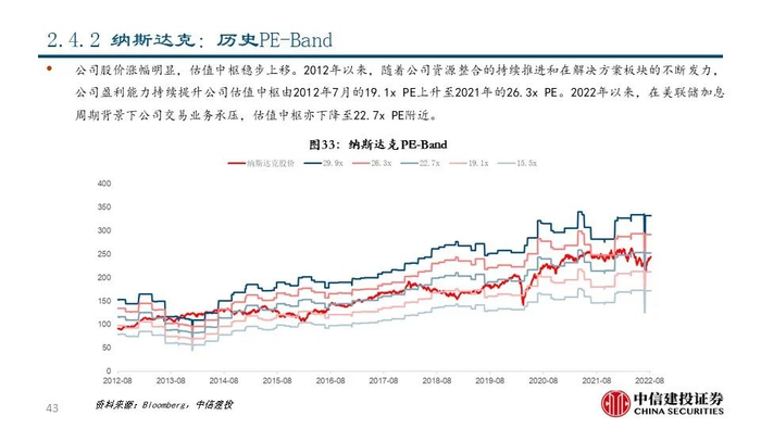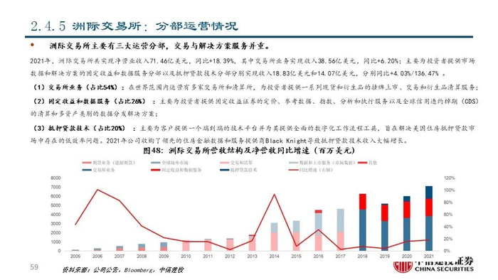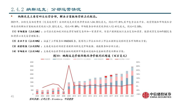 ②纳斯达克(NDAQ US Equity):公司成立于1971年,是世界上第一家电子交易所和领先的交易所集团和市场技术提供商,市值达到293.16亿美元;公司交易技术领先,解决方案板块占比较高;2021年公司实现净营收34.20亿美元,同比+17.81%;其中包含企业平台、投资情报和市场技术分部在内的解决方案板块共实现收入21.52亿美元,占比达62.92%。