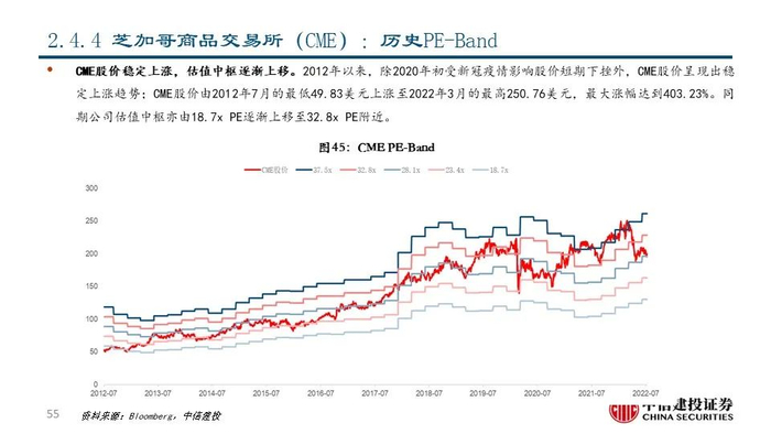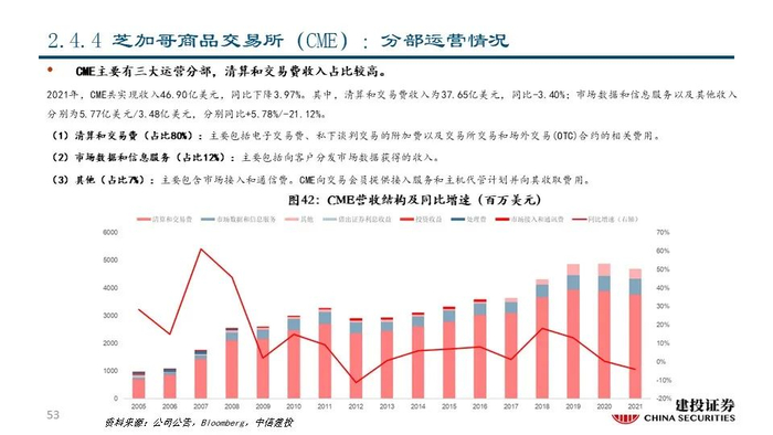 ④芝加哥商品交易所(CME US Equity):公司最早可追溯至1848年成立的芝加哥期货交易所(CBOT),2006年芝加哥商品交易所(CME)并购CBOT后组建新的CME集团,目前是世界领先的商品及衍生品交易所集团,市值达到699.79亿美元;公司资产类别丰富,交易和清算均较为突出,能够为资本市场提供涵盖所有主要资产类别的全球基准产品。2021年公司实现营收46.90亿美元,同比-3.97%;其中清算和交易费收入占比达80.28%,是公司的主要收入来源。