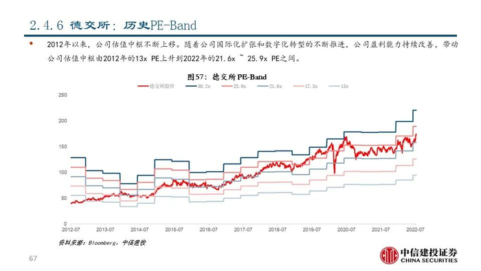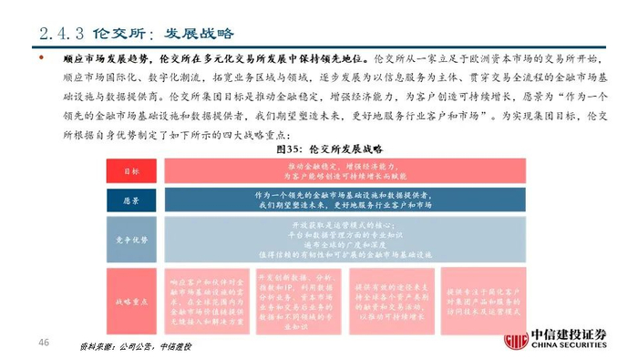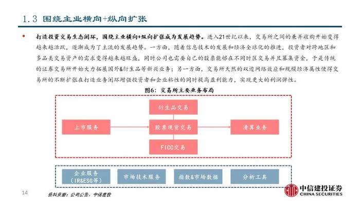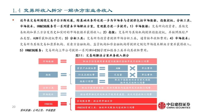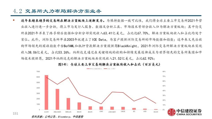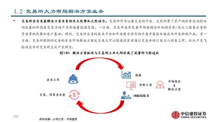 我们认为,交易所具有发展解决方案业务的先天优势和天然动力。交易所作为证券交易的平台,天然积累了资产端和资金端的双向流量和伴随着交易活动产生的海量数据资源。1)交易所具有发展市场数据分析和市场服务的资源禀赋优势和客户基础,通过深度数据服务进一步提升平台粘性;2)交易所不断进行技术迭代,有助于其巩固平台优势甚至进行技术输出;3)交易所提供的完善的资本市场解决方案反过来可以促进投资者进行交易并吸引公司上市,从而产生飞轮效应并对交易所主业产生助力。