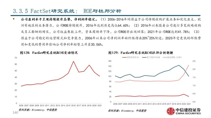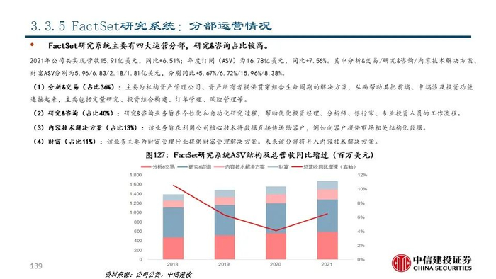 ⑤FactSet研究系统(FDS US Equity):公司成立于1978年,是全球领先的金融分析工具和研究信息平台,目前市值163.48亿美元。公司以金融数据数据服务起家,经过多年的发展持续围绕投资决策的全流程打造了一系列产品和解决方案。2021年公司共实现营收15.91亿美元,同比+15.77%。其中分析&交易和研究&咨询分别占比37.46%和42.93%。