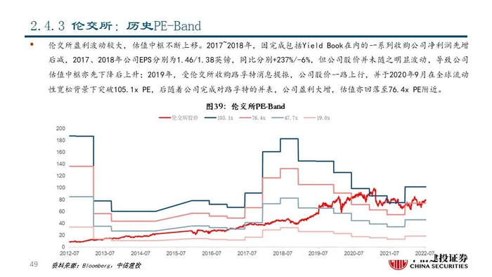 ③伦交所(LSEG LN Equity):公司成立于1801年,是世界领先金融交易平台和信息提供商,市值达到514亿美元。公司不仅有世界一流的交易和清算平台,还通过旗下的富时罗素、路孚特为资本市场提供完善的金融信息服务和资本市场解决方案。2021年由于完成对路孚特(Refinitiv)的并表,公司营收达92.73亿美元,同比+256.79%;其中数据分析业务收入占比激增至67.70%;资本市场业务和交易后业务收入分别占比18.43%和13.41%,交易和交易后业务并重。