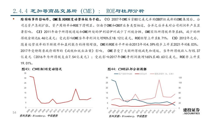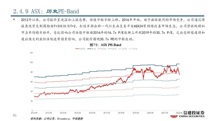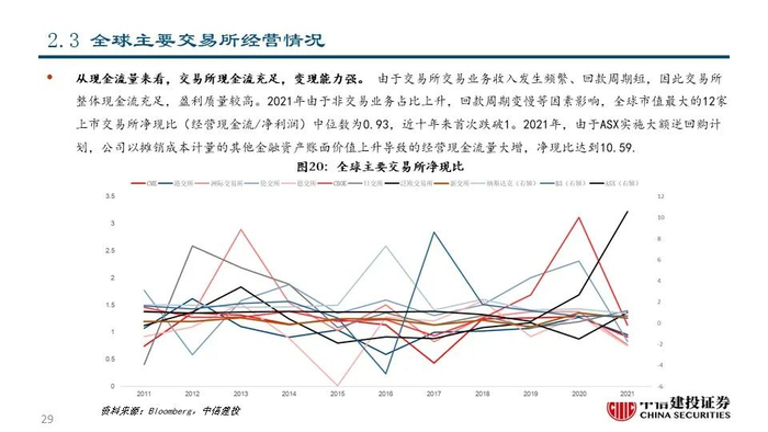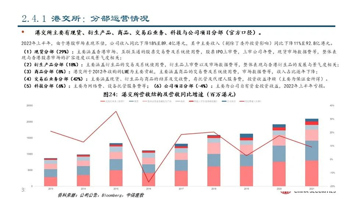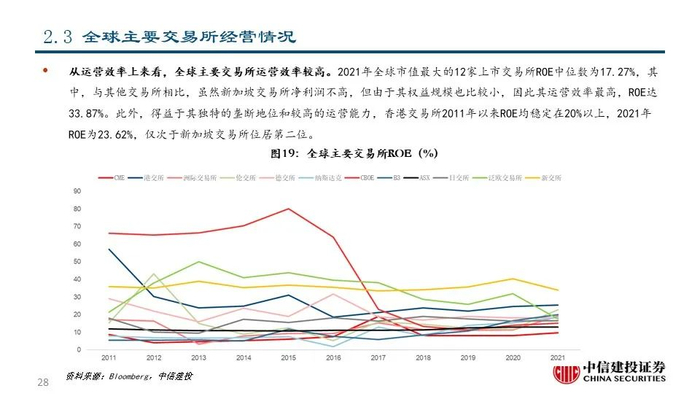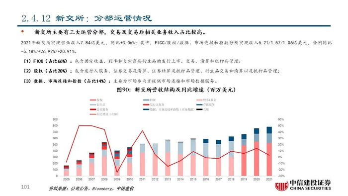 ⑫新交所(SGX SP Equity):公司成立于1973年,是亚洲最国际化的多资产交易所,市值达72.51亿美元。经过二十余年的发展,公司的交易资产类别已包括股票现货、股权衍生品、大宗商品、外汇、固定收益、基金等,为客户一站式整合服务,并成为了连接亚洲和世界的窗口。2021年公司实现营收7.84亿美元,同比+3.06%;其中,与交易和交易后服务相关的FICC和股权两大运营分部分别占比66.39%和20.05%。