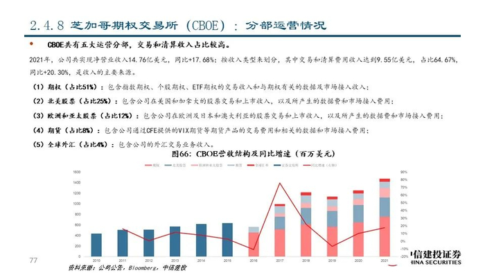 ⑧芝加哥期权交易所(CBOE US Equity):公司成立于1973年,并于2017年收购了另类交易系统BATS,目前是世界领先的衍生品和证券网络,市值达127.07亿美元。作为世界上最早的期权交易所公司以期权业务起家,衍生品业务处于领先地位;2021年公司共实现净营收14.76亿美元,同比+17.68%;其中交易和清算费用收入占比达64.67%,是主要的收入来源。