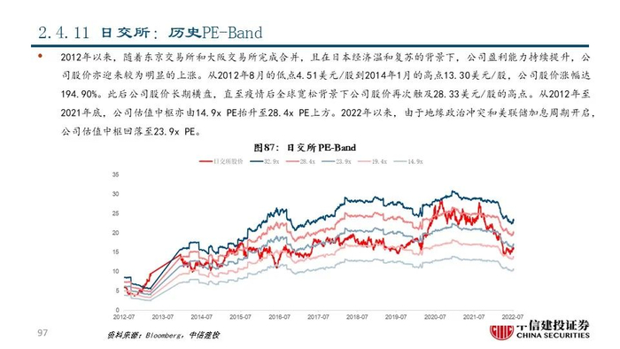 ⑪日交所(8697 JP Equity):公司旗下的东京交易所与大阪交易所最早于1878年成立,于2013年组成日本交易所集团并在东京交易所上市,是亚洲领先的交易所集团,市值达77.74亿美元。通过多年的收购扩张和自身投入发展,公司资本市场业务不断完善,衍生品业务、指数业务、交易后业务均取得长足进步。2021年公司共实现净营收12.1亿美元,同比-4.11%。其中交易服务分部收入占比39.28%,为第一大收入来源。
