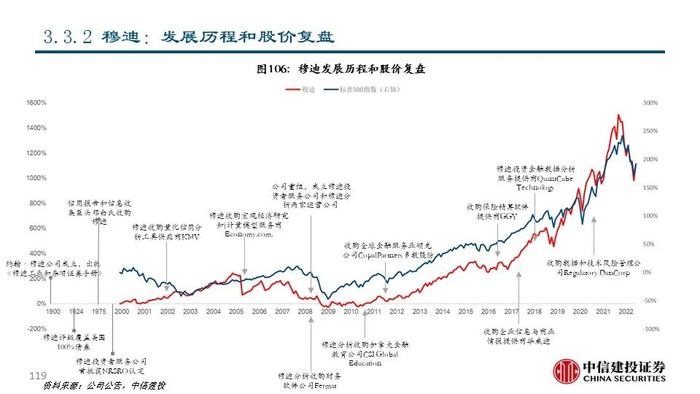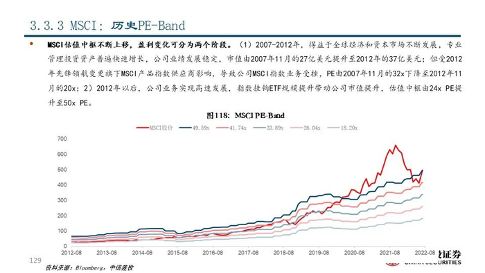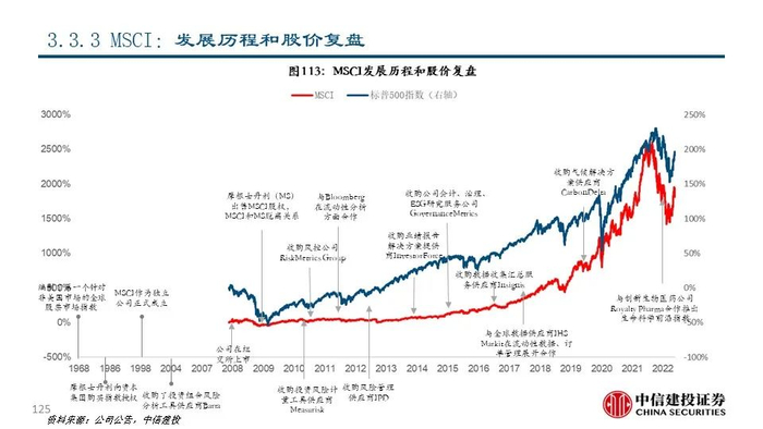 ③MSCI(MSCI US Equity):公司最初由资本集团创建并于1968年开始编制指数,于2007年从摩根士丹利分拆上市后成为全球领先的指数和解决方案提供商,目前市值达363.83亿美元。2021年公司实现营收20.44亿美元,同比+20.54%;其中指数业务收入占比61.25%,是公司的主要收入来源。