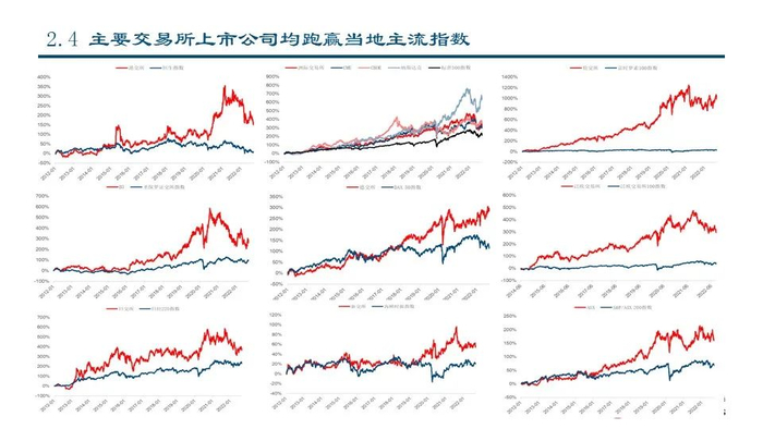 基于各国经济与资本市场的发展,交易所的业绩增长得益于GDP增长*资本化率提升*市场份额提升(部分国家)*变现方式多元化*轻资产规模化效应……,长期股价回报可观,而且显著跑赢当地主流指数。我们重申,好的交易所模式需要:1)资产端与资金端两端发力形成双边网络效应;2)提供高效撮合平台,本质上是由投资者吸引更多的投资者,流动性吸引更大的流动性;3)现货、衍生品与商品市场齐全,市场之间产生协同效应;4)上市、交易、结算等变现方式增多,垂直产业链不断延伸,变现效率提升。