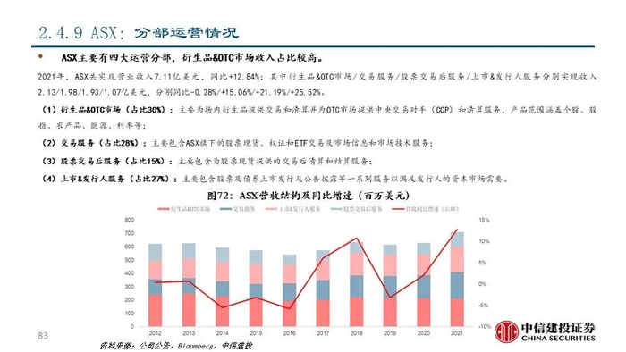 ⑨ASX(ASX AU Equity):公司成立于1987年,由六家澳大利亚地方性交易所合并而成,目前是澳洲最大的交易所集团,市值达102.79亿美元。20世纪以来,公司先后整合了澳大利亚国内的证券交易所和悉尼期货交易所并积极推动电子化进程成为澳洲地区最大的交易所集团和世界最大的澳洲外汇交易平台,衍生品业务突出。2021年,公司共实现营业收入7.11亿美元,同比+12.84%;其中衍生品&OTC市场分部实现收入2.13亿美元,占比29.91%,为其第一大收入来源。