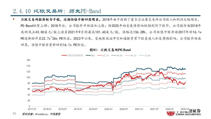 ⑩泛欧交易所(ENX FP Equity):公司成立于2000年,由阿姆斯特丹证券交易所、布鲁塞尔证券交易所和巴黎证券交易所合并而成,是欧洲领先的交易所集团,市值达79.36亿美元。成立以来公司顺应欧洲一体化进程,积极整合欧洲交易所资源;近年来公司积极发展中央证券存管和清算业务,市场体系得到进一步完善。2021年公司共实现营收14.83亿美元,同比+46.84%;其中交易业务占比达36.84%;交易后收入占比为25.57%且呈现逐年上升态势。