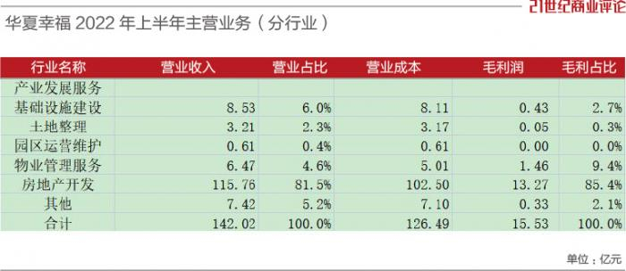 今年上半年,华夏幸福主营业务的营收为142亿元,其中房地产开发提供了超八成的贡献;毛利润为15.5亿元,房地产开发贡献超85%,园区运营服务贡献9.4%,基础设施建设贡献2.7%。