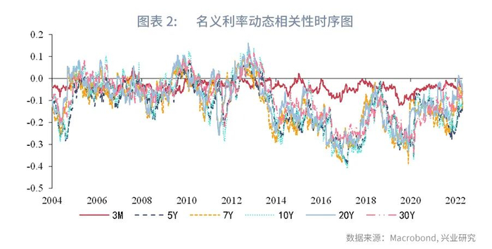 我们发现,不同期限实际利率整体走势趋同,不过不同期限实际利率波动幅度存在差异,期限越短波动幅度越大。为了甄别名义利率以及通胀预期对于金价的不同影响,本章节中我们建立DCC-GARCH模型测算2004年4月至今黄金价格与各期限名义利率、通胀预期以及实际利率的动态相关性并计算2004年至今总体的相关性系数,以筛选后续的建模指标。