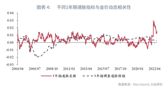 Khramov(2013)报告中选择1年期调查通胀预期(密歇根或者Livingston)作为通胀端变量,不过我们的测算显示,采用1年期通胀互换表征通胀,其与金价的动态相关性要高于1年期调查通胀预期且相对更加稳定、高频,同时因为TIPS债券所隐含的盈亏平衡通胀率中部分期限是基于插值法推算得出而并非实际交易结果,故而本章节中我们统一采用市场交易产生的通胀互换表征通胀预期。