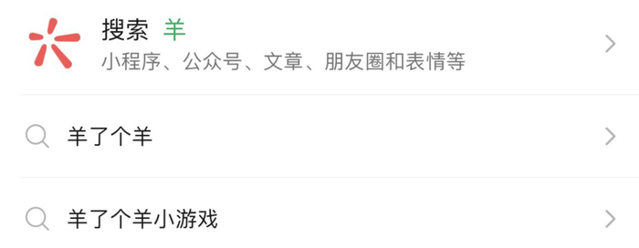 在微信搜索框里输入一个“羊”字 大数据就会自动联想到这个游戏。