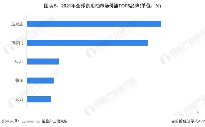 从品牌市占率来看,依据Euromonitor数据,2021年全球食用油市占率前五的品牌中,有三个品牌出自中国,分别是金龙鱼、福临门(中粮集团旗下)和鲁花,市占率分别为5.0%、4.5%和1.0%,反映我国食用油品牌的国际竞争力强劲。