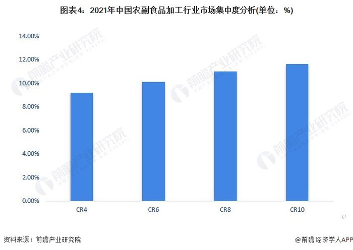 2021年,我国农副食品加工业龙头企业的市场集中度水平不高,主要由于行业整体市场庞大。具体来看,农副食品加工行业CR4仅为9.18%,CR6为10.11%,CR10也仅为11.63%。整体来看,我国农副食品加工行业的竞争较为激烈。