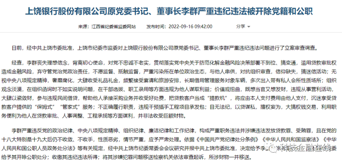 9月15日,江西省纪委省监委官方微信“廉洁江西”发布的消息显示,上饶银行原党委书记、董事长李群严重违纪违法被开除党籍和公职。李群于今年6月2日涉嫌严重违纪违法被查。