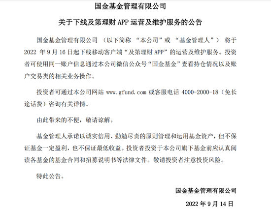 9月14日,国金基金发布公告称,将于2022年9月16日起下线移动客户端“及第理财APP”的运营及维护服务。投资者可使用同一账户信息通过本公司微信公众号“国金基金”查看持仓情况以及账户交易类的相关业务操作。这已经是今年第五家公募基金公司宣布终止APP运营。不久前,中融基金也公告称,8月26日起下线中融基金移动端APP的运营及维护服务。