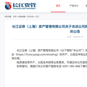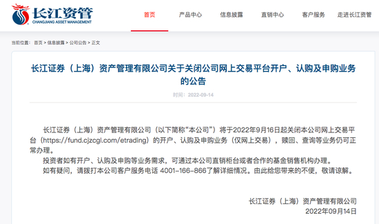 9月15日,中国证券报记者以个人投资者的身份致电长江资管客服,对方回应,根据业务发展考虑关闭公司网上交易渠道包括官网和微信公众号入口,但在长江证券、蚂蚁等公募基金销售机构网上渠道上架的产品仍可以正常购买。