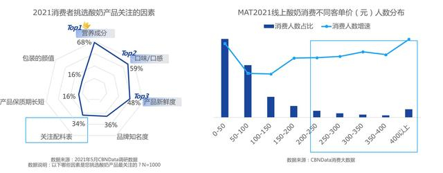 CBNData消费大数据显示,2021年对酸奶市场调查发现,目前消费者也变的更加挑剔,68%和59%的消费者将酸奶的营养成分和口味作为选择酸奶的前两大因素,而从线上酸奶销售的客单价看,大部分还集中在0-50元和50元到100元的范围里,但酸奶中高消费人群的人数增长增速则更为突出。