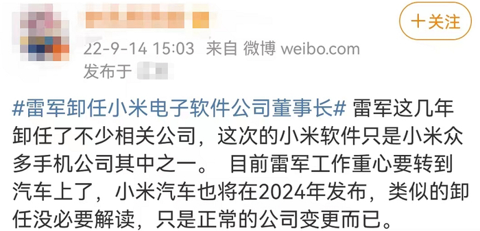 小米集团公关部总经理王化曾在个人微博中回应,称属正常的变更,表示雷军的精力主要放在了造车相关的事务上面,高管们已经可以分担相关的一些工作和职责,“能不管的事情一定不管。”