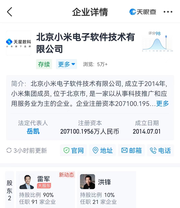 资料显示,北京小米电子软件技术有限公司成立于2014年7月,注册资本约20.71亿人民币,由雷军和洪锋分别持股90%、10%。公司实控人为雷军。