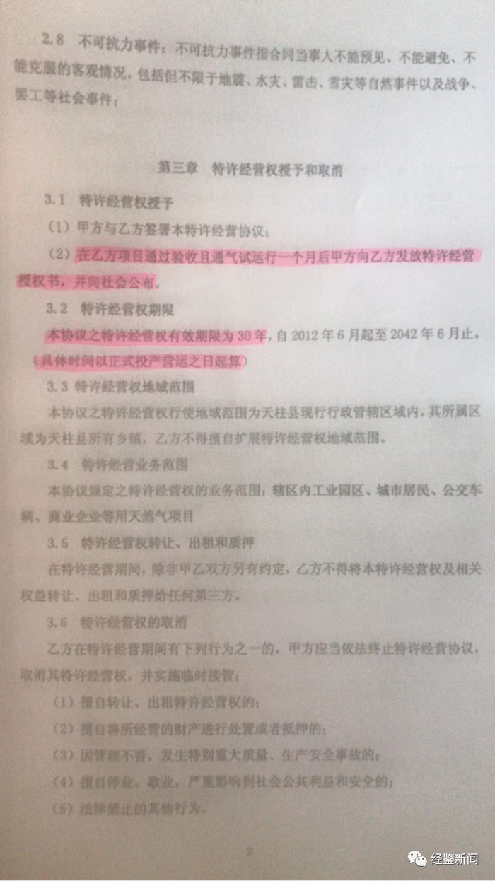 协议“第三章3—1(2)条”明确:乙方(天柱县新昆公司)项目通过验收特许经营且通气试运行一个月后甲方(天柱县人民政府)向乙方发放特许经营授权书,并向社会公布。