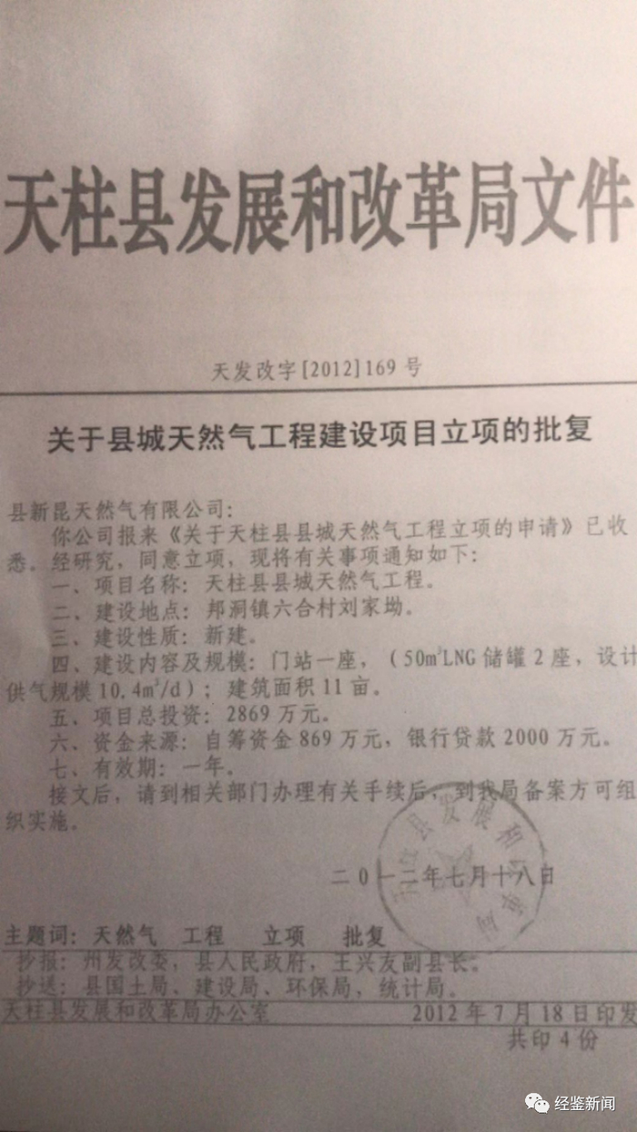 2012年7月18日,天柱县发展和改革局对县城天然气工程建设项目立项做出批复。