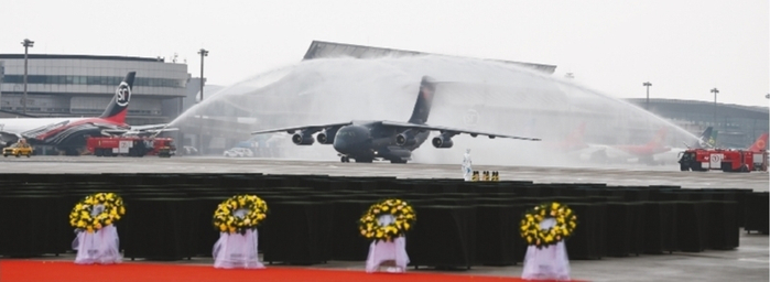 专机进入中国领空后,空军两架歼-20战斗机护航伴飞,向志愿军烈士致以崇高敬意;停机坪上,机场架起“水门”,为志愿军烈士接风洗尘。