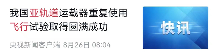 8月26日,由中国航天科技集团有限公司一院自主研制的升力式亚轨道运载器重复使用飞行试验获得圆满成功,成功实现我国亚轨道运载器的首次重复使用飞行,有力推动我国航天运输技术由一次性使用向重复使用的跨越式发展。