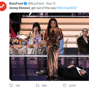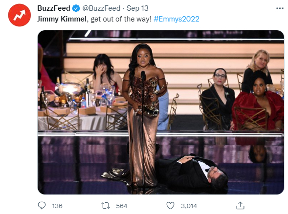 阿奈特从在躺在地上的坎摩尔口袋里掏出颁奖卡,念出了ABC喜剧《小学风云》(Abbott Elementary)编剧昆塔·布伦森的名字,人们随即为布伦森送上欢呼和掌声。《小学风云》是在ABC播出的一个伪纪录片式情景喜剧,故事发生在一所以黑人为主的学校。