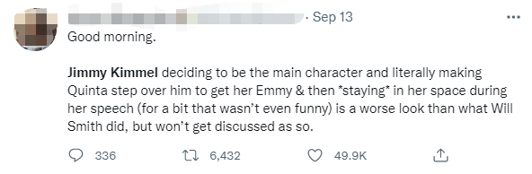 此外,出演《小学风云》并拿下当晚艾美奖喜剧类最佳女配角的雪莉·李·拉尔夫(Sheryl Lee Ralph)向记者表达了自己的不满,称自己当时很困惑,希望那个人从地上爬起来,后来发现是吉米·坎摩尔的时候,她当面向坎摩尔表达了自己的观点——此举“不尊重人”,并称对方明白了。