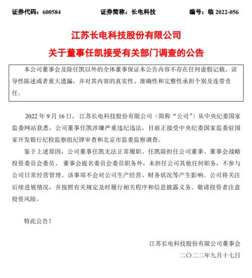 长电科技9月16日晚间公告,公司从中央纪委国家监委网站获悉,公司董事任凯涉嫌严重违纪违法,目前正接受中央纪委国家监委驻国家开发银行纪检监察组纪律审查和北京市监委监察调查。鉴于上述原因,任凯无法正常履职。任凯除担任公司董事、董事会战略投资委员会委员、董事会提名委员会委员职务外,未担任公司其他任何职务,不参与公司日常经营管理。该事项不会对公司生产经营、财务状况等产生影响。