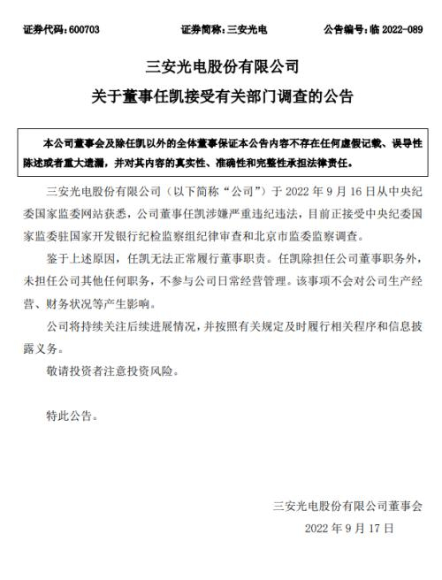 三安光电发布公告,于2022年9月16日从中央纪委国家监委网站获悉,公司董事任凯涉嫌严重违纪违法,目前正接受中央纪委国家监委驻国家开发银行纪检监察组纪律审查和北京市监委监察调查。鉴于上述原因,任凯无法正常履行董事职责。任凯除担任公司董事职务外,未担任公司其他任何职务,不参与公司日常经营管理。该事项不会对公司生产经营、财务状况等产生影响。