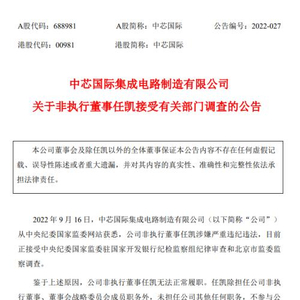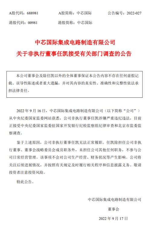 9月16日,中芯国际公告,公司非执行董事任凯涉嫌严重违纪违法,目前正接受中央纪委国家监委驻国家开发银行纪检监察组纪律审查和北京市监委监察调查。