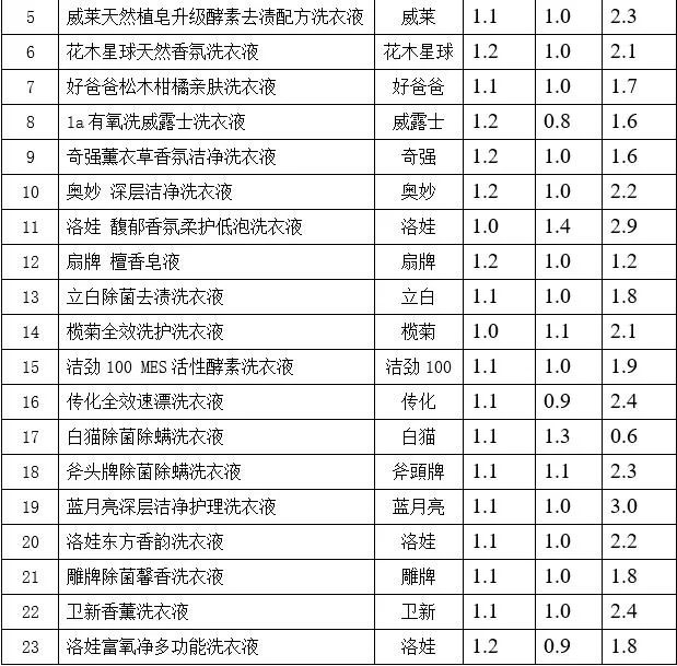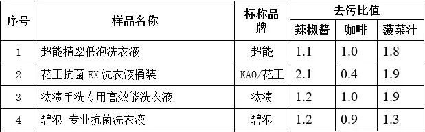 其中标称“洛娃馥郁香氛柔护低泡洗衣液”“超能植翠低泡洗衣液”“浪奇除菌洗衣液”“威莱天然植皂升级酵素去渍配方洗衣液”“好爸爸松木柑橘亲肤洗衣液”“蓝月亮深层洁净护理洗衣液”“花木星球天然香氛洗衣液”“立白除菌去渍洗衣液”“奥妙深层洁净洗衣液”等9款样品对蛋白污渍的去污能力表现突出,并且对其他两种污渍的去污效果也比较好。