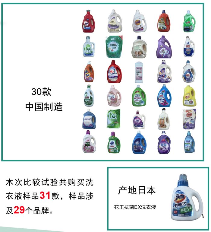 本次比较试验共购买洗衣液样品31款,样品涉及29个品牌,除“花王抗菌EX洗衣液”样品标注产地为日本外,其他均为中国制造。