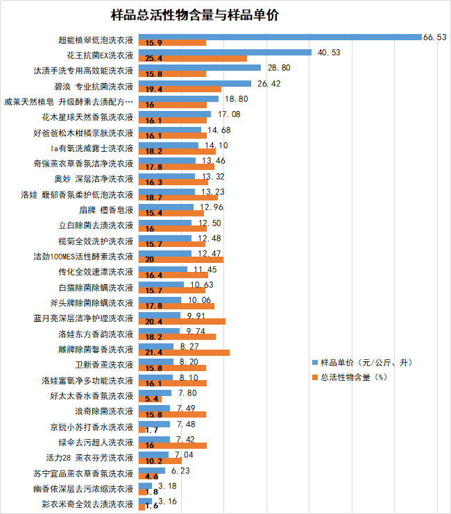 洗涤剂中总活性物含量直接关系着洗衣液的去污能力,也可反映出洗涤剂的成本情况及质量水平。一般来讲,总活性物含量越高的洗涤剂,去污效果越好,价格相对较高。