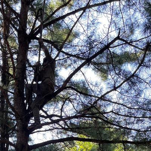 站在红松树下,霍旭戴好手套,向上抛6米多的长杆,弯曲的铁钩稳稳地挂在树枝上。他双手抓着长杆,用腿盘住树干,腰部发力向上挪动。不出几秒,他的身体已隐入层层叠叠的枝叶深处。